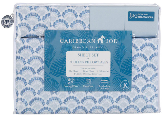 Bring coastal charm to your space with this sheet set by Caribbean Joe named Scalloped Shells. Featuring a white background adorned with blue shell patterns arranged in graceful fan formations, this 6-piece set includes 1 flat sheet, 1 fitted sheet, 2 printed pillow cases, and 2 cooling pillow cases. Made from 100% polyester, it offers soft comfort with breezy seaside elegance.