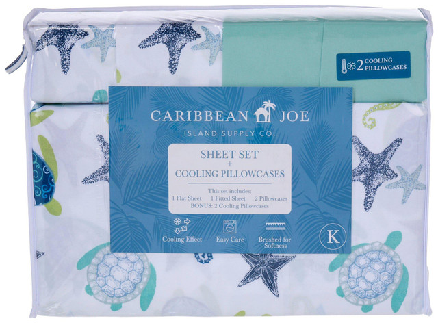 Drift into comfort with this 6-piece Cooling Tamarindo Sheet Set, featuring a playful sea animal print. The set includes 1 flat sheet, 1 fitted sheet, 2 printed pillowcases, and 2 cooling pillowcases.