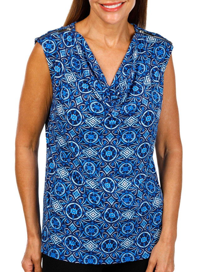 This cap sleeve blouse features stylish zipper shoulders and is crafted from soft stretchy fabric for all day comfort. Sleek and modern, this top adds a stylish twist to everyday outfits. Fabrication is 95% polyester and 5% spandex.