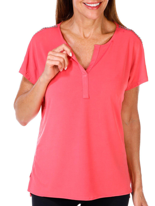 This short sleeve blouse features a stylish split neckline and subtle square decorative accents on the shoulders. Crafted from soft, stretchy fabric, it offers all-day comfort while adding a polished touch for dressier occasions. Fabrication is 94% polyester and 6% spandex.