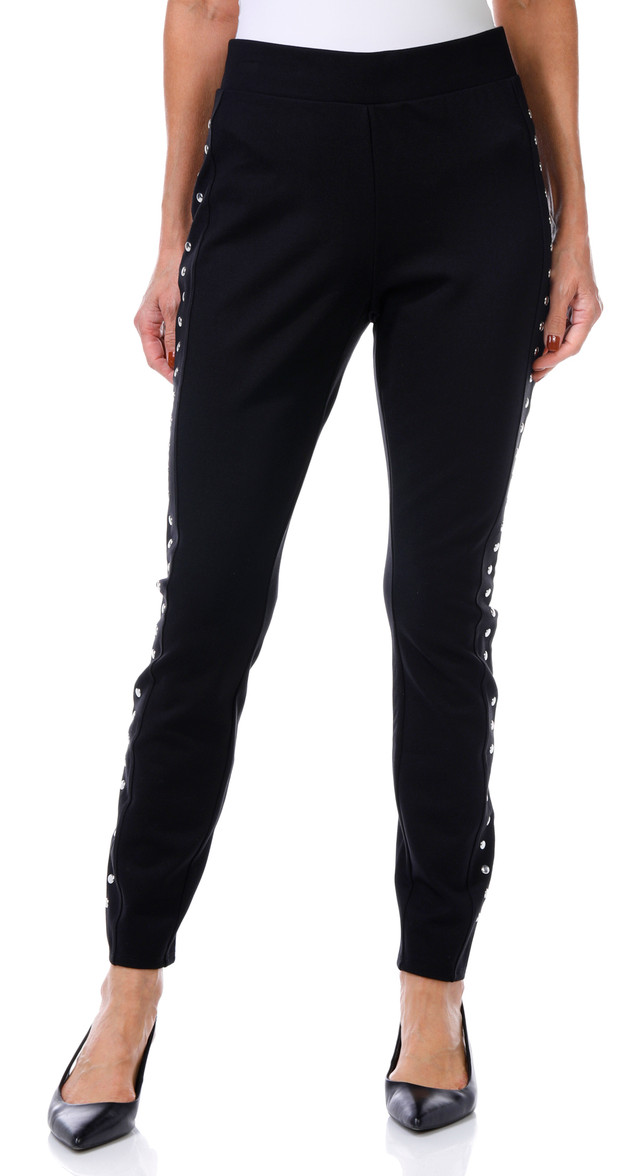 Add edge to your everyday look with these Women's Side Stud Ponte Leggings. Crafted from soft, stretchy ponte fabric, they offer a sleek fit with stylish side stud detailing. Perfect for dressing up or down, these leggings blend comfort with a touch of bold flair. Fabrication 66% rayon, 29% nylon, 5% spandex