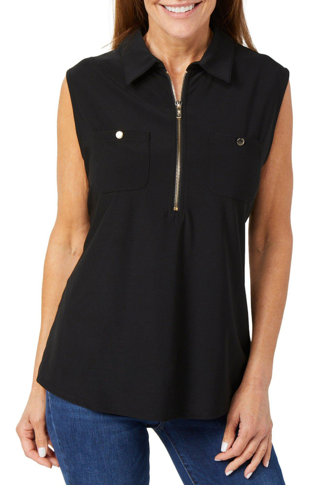Stay cool and stylish in this womens sleeveless top featuring a stretchy fit, chest pockets with decorative buttons, and a polo collar with a sleek zipper. Perfect for layering or wearing solo, this versatile piece adds a sporty touch to casual outfits while keeping comfort front and center. Fabrication is 95% polyester and 5% spandex.