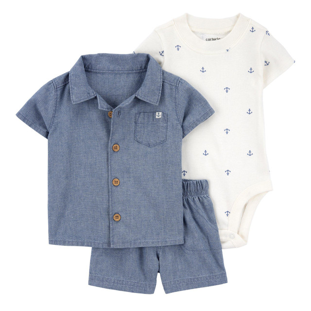 Stock up on three sweet pieces for baby, including a short-sleeve bodysuit, chambray shirt, and a pair of coordinating pull-on shorts to complete the look. This set features: Short sleeves, Ribbed trim, Covered elastic waistband for a comfy fit, Overlap shoulders for easy over the head, Strong snaps on the legs keep up with wear, wash, repeat. 100% cotton.