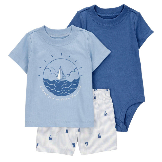 Crafted in soft cotton, this set of three is perfect for mixing and matching. Short sleeves. This set features Ribbed trim, Covered elastic waistband for a comfy fit, Strong snaps keep up with wear, wash, repeat. 100% Cotton.