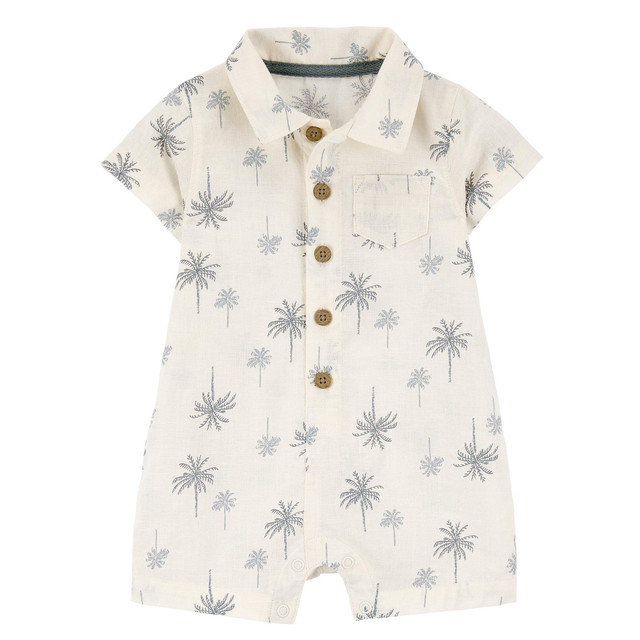 Crafted in soft cotton with allover palm trees, this super cute romper was made for him. This set features: Short sleeves, Strong snaps on the legs keep up with wear, wash, repeat. 100% cotton.