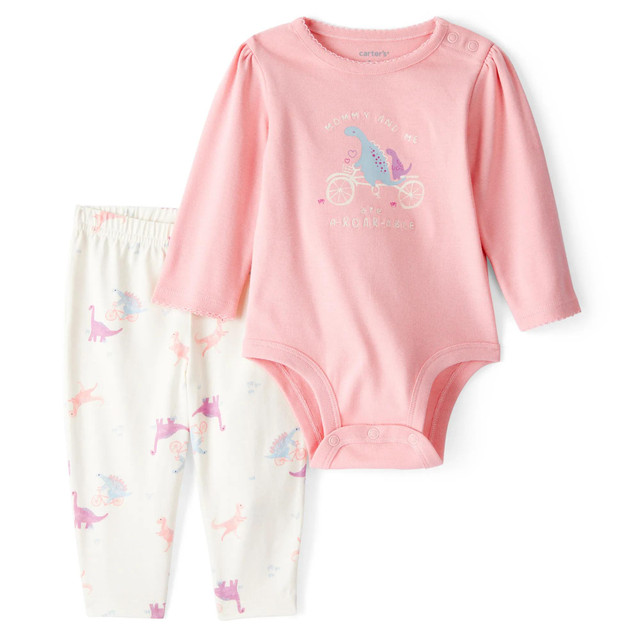 This dinosaur-themed set combines prehistoric charm with everyday comfort. The long-sleeve bodysuit features a playful pastel dinosaur print, Mommy & Me riding a bike. Snap closures at the legs make outfit changes easy, while the stretchy cotton blend moves with your baby. The matching paperbag pants add the perfect stylish touch for everything from tummy time to nap time.