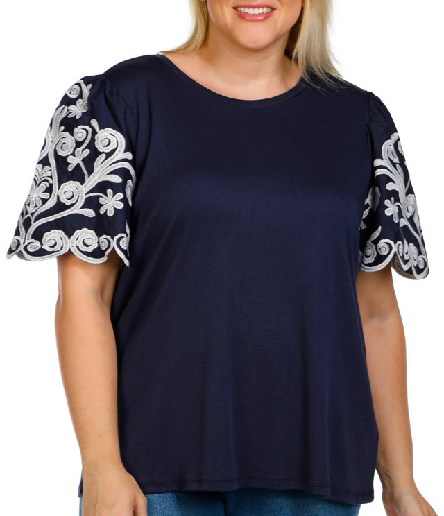 This Plus Short Sleeve Embroidered Top features a solid color with beautifully detailed embroidery on the sleeves. Designed with a classic crew neckline and soft short sleeves, it offers a simple yet elegant look for everyday wear.
