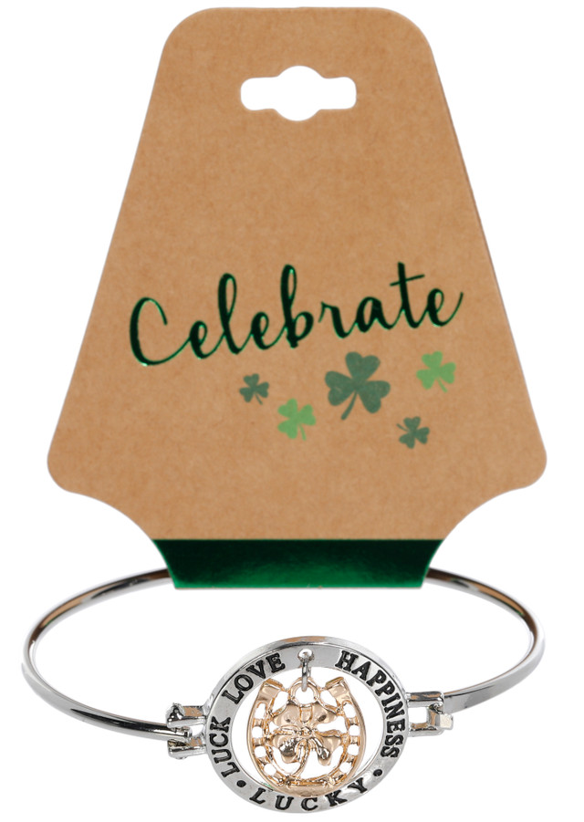 Add meaningful style to your St. Pattys look with this Affirmation Bangle Bracelet. Designed with inspiring words including Luck, Love, Happiness, and Lucky, this bracelet is accented with a charming gold four leaf clover charm. A festive and uplifting accessory perfect for celebrating the season or gifting a little extra positivity.