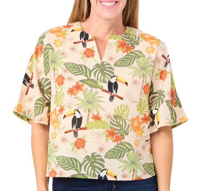 Embrace the essence of nature with the Petite Short Sleeve Tropical Split Neck Top. Featuring a flattering split neckline, bell short sleeves and a vibrant print, this top is perfect for warm weather and sunny days. Made from soft, breathable fabric, it ensures all day comfort and ease. Whether you're heading to the beach or a casual outing, this tee adds a touch of tropical flair to your wardrobe. Fabrication is 100% polyester. Length measures approximately 23 in.