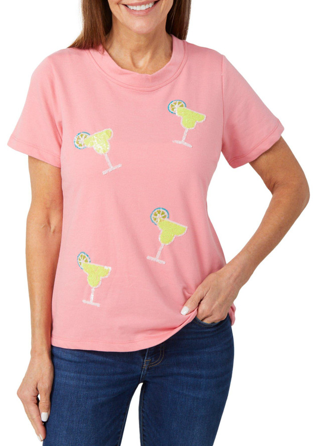 Cheers to fun fashion with the Petite Sequin Margarita Top! Featuring a round neckline, short sleeves, and a sparkling sequin margarita design, this playful piece adds a festive twist to your casual look. Perfect for parties, vacations, or happy hour vibes. Fabrication 52% cotton, 48% polyester