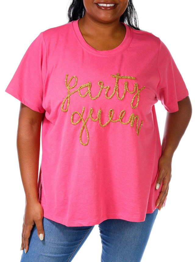 Elevate activewear with the Plus Party Queen Short Sleeve Crew Neck Top. Featuring embroidered Party Queen text on the front, it combines casual style with everyday versatility for workouts or relaxed outings. Ideal for pairing with leggings or joggers. Fabrication is 52% cotton, 48% polyester.