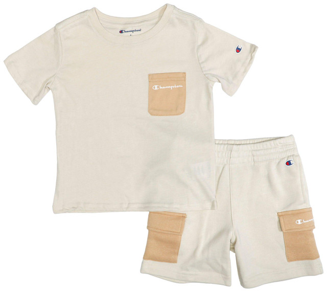 This Champion Little Boys 2 Piece Set combines comfort and sporty style. The soft tan top features a classic crew neck, short sleeves, and a convenient chest pocket for a casual yet functional look. Paired with matching bottoms, these shorts offer an elastic waistband for a secure fit, along with two front pockets and two cargo pockets for extra storage. Perfect for active days, playtime, or everyday wear, this set delivers effortless style and all-day comfort.