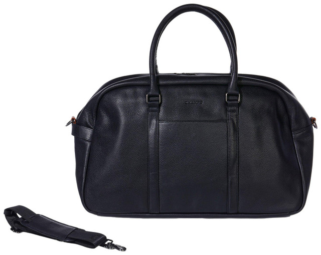 Travel smart with the Champs Black Leather Duffle bag, crafted for both style and security. Equppied with an RFID - blocking pocket, it safeguards your credit cards and passport from electronic thefts, providing peace of mind on every journey. featuring two exterior pockets, thre inside pockets one with a zipper. It also has a trolley sleeve for efotless transport, and an adjustable shoulder strap for comfort, this sleek and durable bag keeps your essentials organized.
