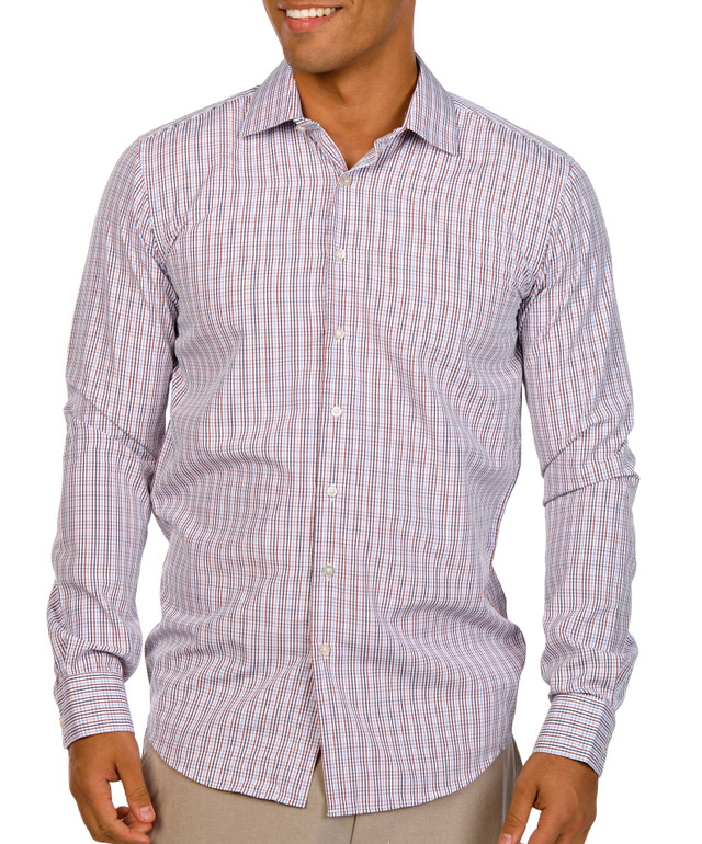 This mens long sleeve button down shirt features a slim fit design in a plaid pattern for a sharp modern look. Made with stretchy moisture wicking fabric, this shirt keeps you comfortable while resisting wrinkles, making it perfect for work travel or polished everyday wear. Fabrication is 97% polyester and 3% spandex.
