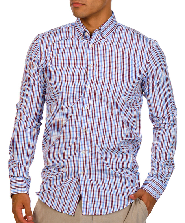 This mens long sleeve button down shirt features a slim fit design in a plaid pattern for a sharp modern look. Made with stretchy moisture wicking fabric, this shirt keeps you comfortable while resisting wrinkles, making it perfect for work travel or polished everyday wear. Fabrication is 97% polyester and 3% spandex.