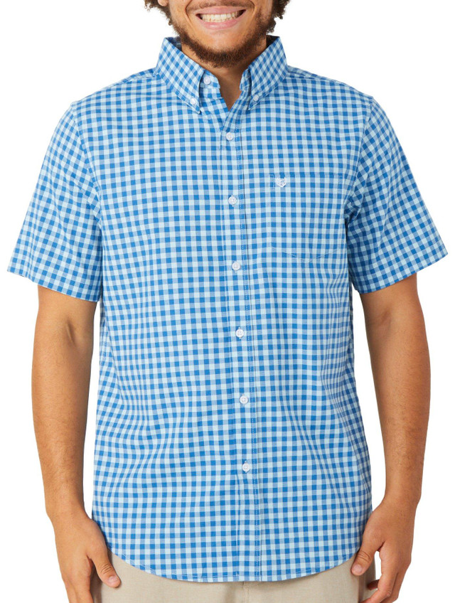 This men's short sleeve gingham button down shirt features a classic button front closure, collared neckline, and a chest slip pocket. The soft fabric and timeless gingham print make it a versatile choice for casual or semi dressed looks. Fabrication 61% cotton, 36% polyester, 3% spandex.