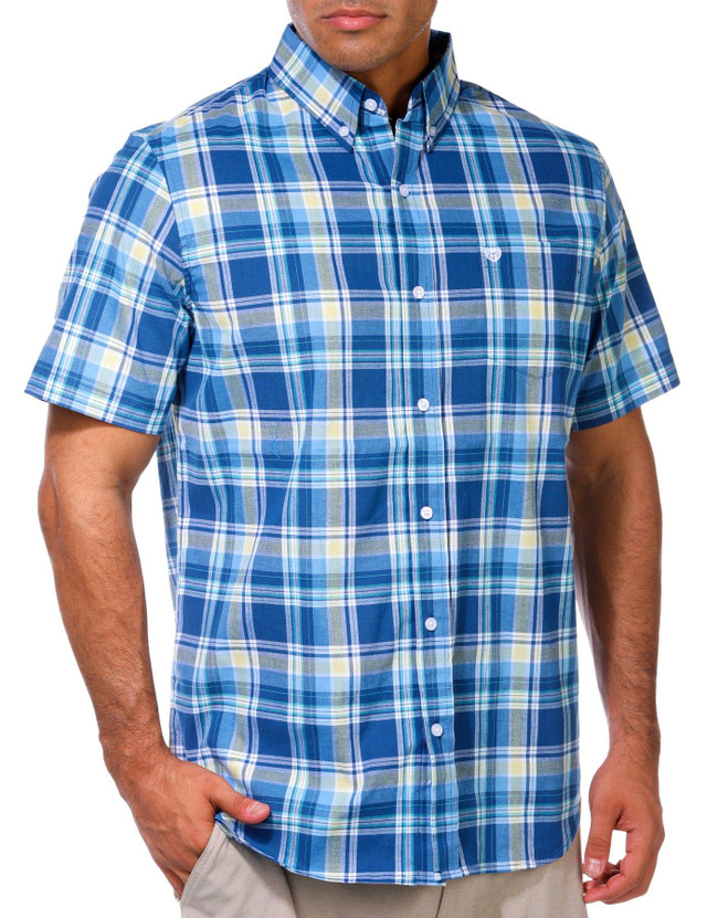 This mens short sleeve plaid button down shirt features a classic button front closure, collared neckline, and a chest slip pocket. The soft fabric and timeless plaid print make it a versatile choice for casual or semi dressed looks. Fabrication 61% cotton, 36% polyester, 3% spandex.