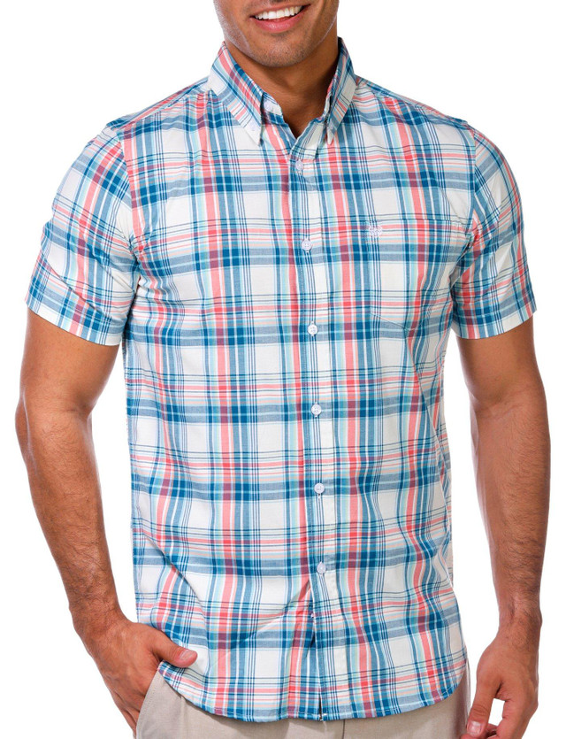 This mens short sleeve plaid button down shirt features a classic button front closure, collared neckline, and a chest slip pocket. The soft fabric and timeless plaid print make it a versatile choice for casual or semi dressed looks. Fabrication 61% cotton, 36% polyester, 3% spandex.