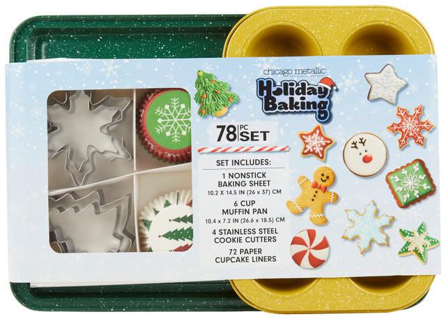 Celebrate seasonal baking with the 78 Piece Holiday Baking Set featuring essential tools for festive treats. Set includes one 10 x 14.5 in nonstick baking sheet, one 10 x 7 in 6 cup muffin pan, four stainless steel holiday cookie cutters and seventy two paper cupcake liners. Hand wash recommended. Ideal for creating joyful holiday confections.