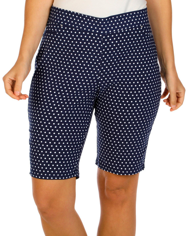Add a playful touch to your warm-weather wardrobe with these Bermuda Shorts, featuring a charming polka dot print and a comfy elastic waistband. Easy to wear and effortlessly stylish, theyre perfect for sunny strolls, weekend getaways, or casual days out. Inseam measures approximately 11 in. Fabrication is 76% rayon, 21% nylon, 3% spandex.