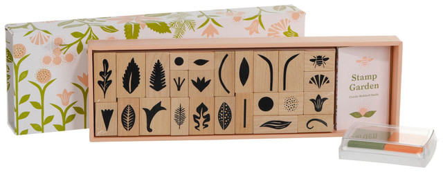 Grow your own garden with this set of high-quality rubber stamps and two colored ink pads. The sturdy matchbox-style box features twenty-five wood-backed stamps in an assortment of shapes and textures, from leaves and stems to buds and petalseven a bee! A verdant kit of parts, Stamp Garden contains all the botanically inspired pieces you need to cultivate an imaginary garden, beautiful bouquet, or botanical patternthe combinations are infinite.