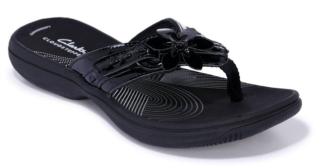 Perfect your look with the Clarks Breeze Opal sandal. The hook & loop pair is elevated by floral detailing for a feminine flair. Finished off with a functional impact-absorbing Cushion Soft footbed and a durable EVA sole.
