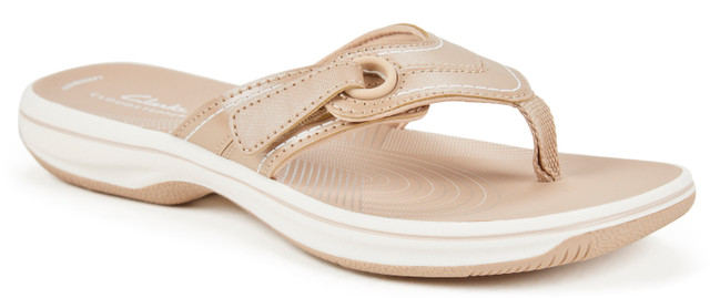 Flip-flop Breeze Reyna is part of Clarks Cloudsteppers collection, so you know that total underfoot comfort is a sure thing. Built for summer holidays and lazy weekends in the back garden, it's crafted with soft fabric uppers for a skin-gentle feel, while grippy soles make for confident support and easy-breezy steps. Features round toe, slip-on and Riptape closure. Heel height: 1.125 in. Shoe width: medium. Upper and Lining: textile. Sole: 100% manmade.
