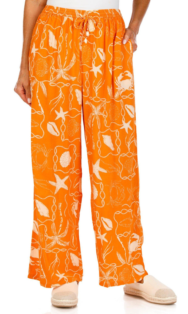 These orange swim cover-up pants are light, airy, and perfect for beach days. Featuring a playful shell pattern, an elastic waistband, and a drawstring for comfort, they offer effortless style and a breezy fit. Ideal for slipping on after a swim, they bring a splash of fun to your seaside look.