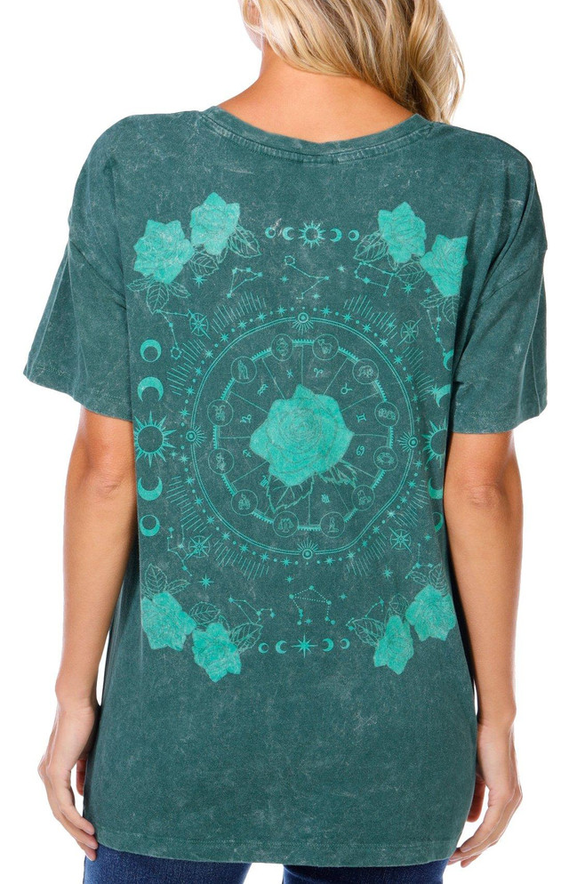 The Juniors Celestial Roses Graphic Tee blends vintage vibes with cosmic charm, featuring a classic crew neckline, short sleeves, and an embroidered sun on the chest. A celestial-inspired back graphic with roses adds a dreamy, standout touch to this everyday essential. Fabrication 100% cotton
