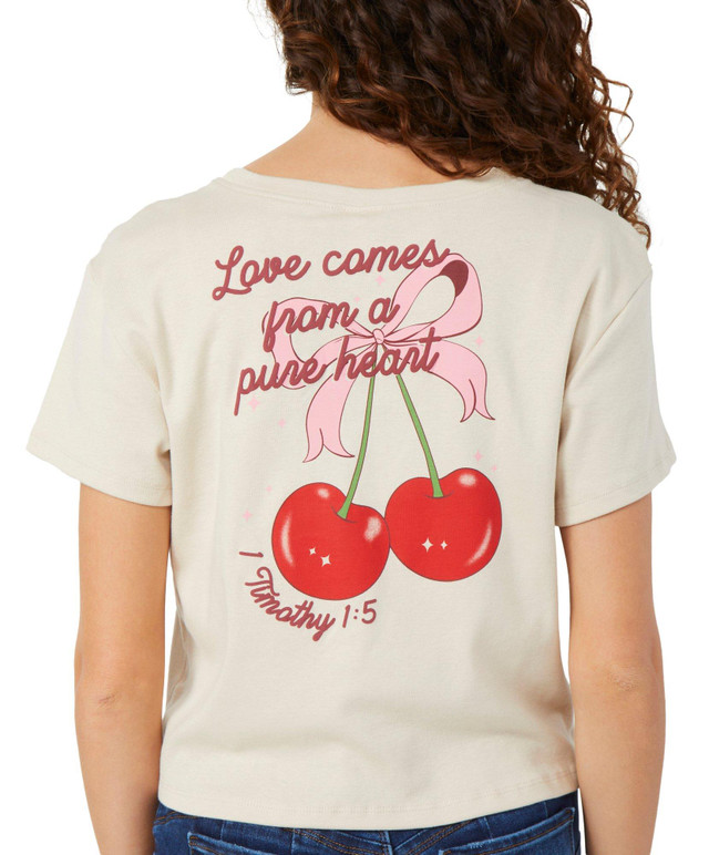 Sweeten your style with the Juniors Cherry Bows Graphic Tee. Featuring a cute cherry bow graphic on the chest and back, plus a heartfelt Love Comes From A Pure Heart script on the back, this soft tee adds charm and positivity to any casual outfit.