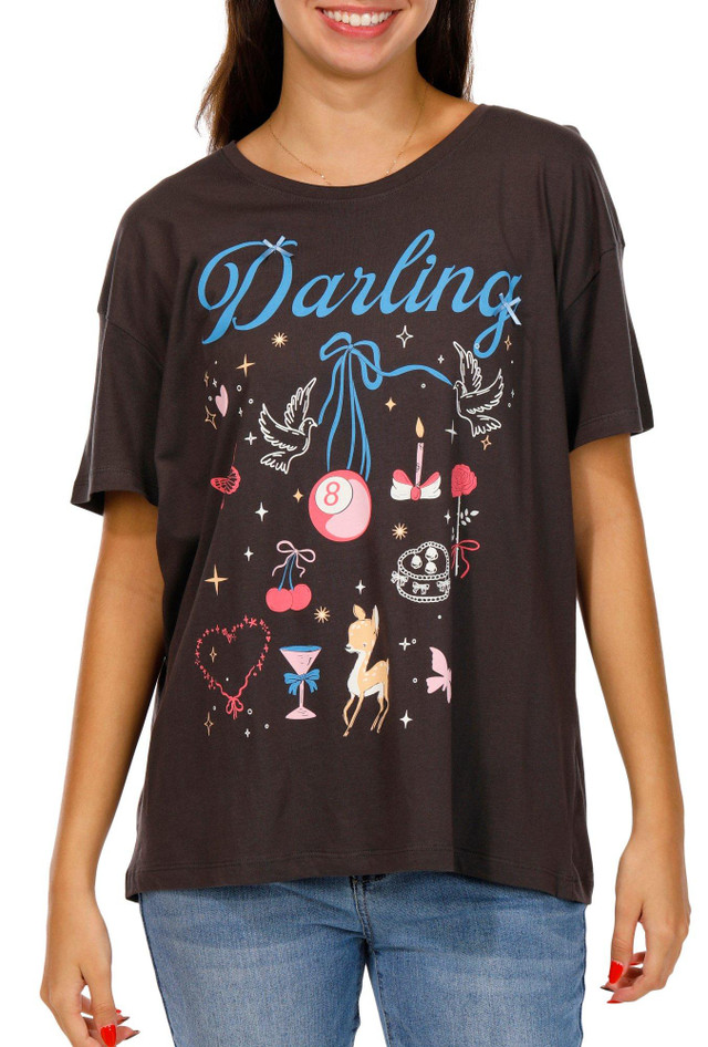 Show off your playful side with this Juniors Girly Darling Graphic Tee, featuring a trendy graphic design that adds charm and attitude to any casual look.