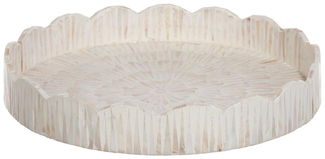 Elevate your home decor with this stunning 15-inch Decorative Scalloped Mop Tray. Crafted from luxurious capiz shell, this tray features an elegant scalloped trim that adds a touch of sophistication to any setting. Perfect for displaying trinkets, serving guests, or simply as a decorative centerpiece, its iridescent finish and intricate design make it a versatile and stylish addition to your home.