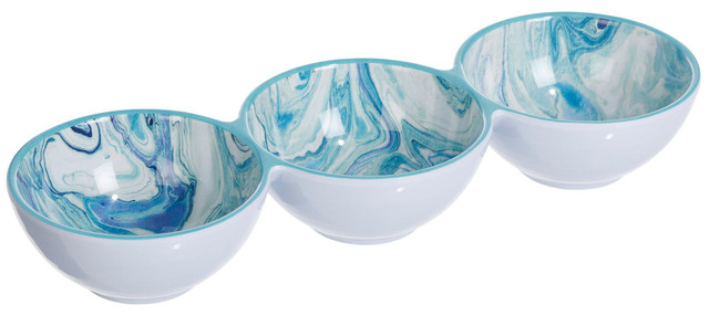 Serve in style with this 15 inch melamine 3-section server, designed with a coastal marble pattern in soothing ocean tones. Perfect for appetizers, dips or small bites, it adds a touch of seaside elegance to casual meals, picnics or outdoor entertaining. Fabrication is 100% melamine. Measures approximately 15 in x 5 in x 2 in.