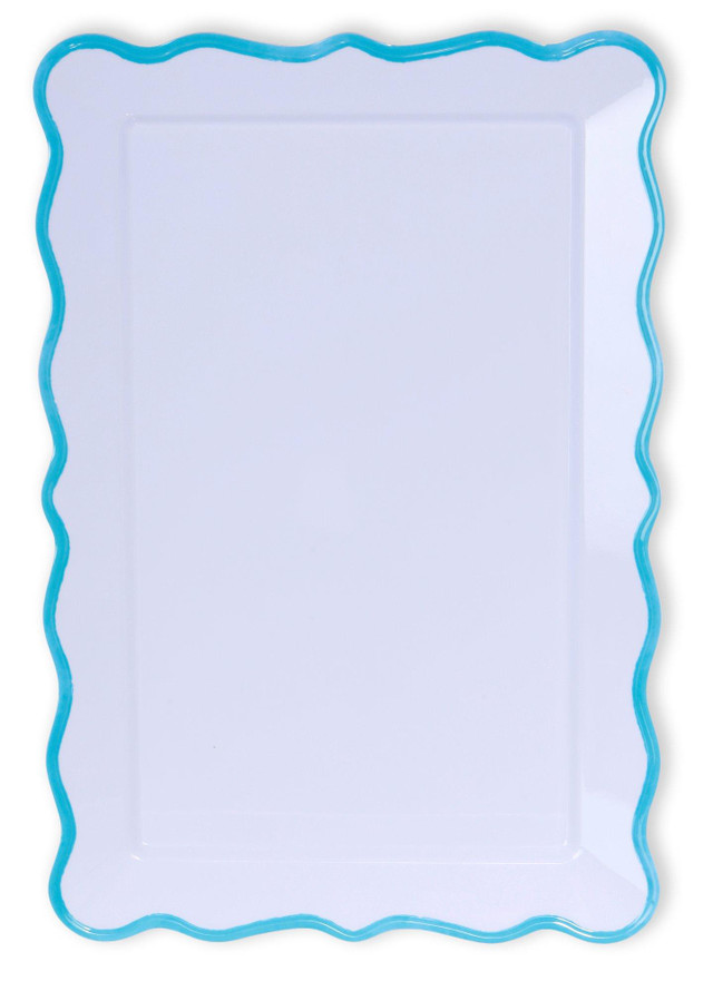 Serve your guests with elegance using this 18.5-inch Melamine Scalloped Edge Serving Tray. Measuring 18.5 inches by 12 inches, this tray features a beautiful scalloped edge design that adds a touch of sophistication to any occasion. Its durable melamine construction ensures long-lasting use, and it is dishwasher safe on the top shelf for easy cleaning. Perfect for both indoor and outdoor entertaining!