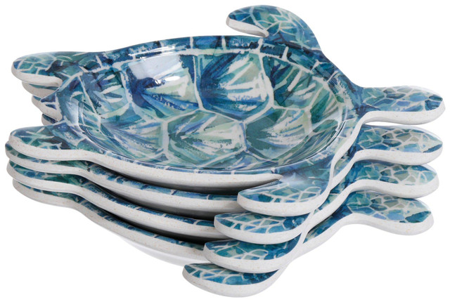 Bring a touch of the ocean to your table with this 4 pack of melamine tidbit bowls, each featuring a charming sea turtle design. Perfect for serving snacks, dips or small sides, these durable bowls offer coastal style thats ideal for casual dining or outdoor gatherings. Fabrication is 100% melamine. Measures approximately 6 in x 4.5 in.