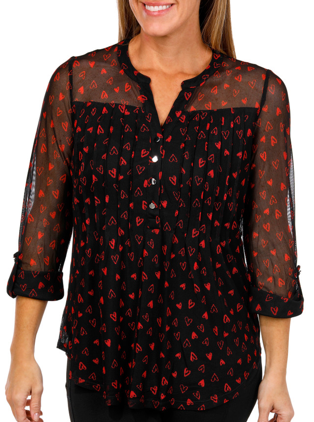 The Womens 3/4 Sleeve Pleated Heart Print Top brings a sweet, polished touch to everyday style with its soft drape and charming allover heart pattern. Made from a smooth blend of 95% polyester and 5% spandex, it offers lightweight comfort with just the right amount of stretch. The pleated front adds a flattering finish, while the 24inch length provides easy, versatile wear with jeans, skirts, or work pants. A playful yet refined piece that transitions effortlessly from day to evening.