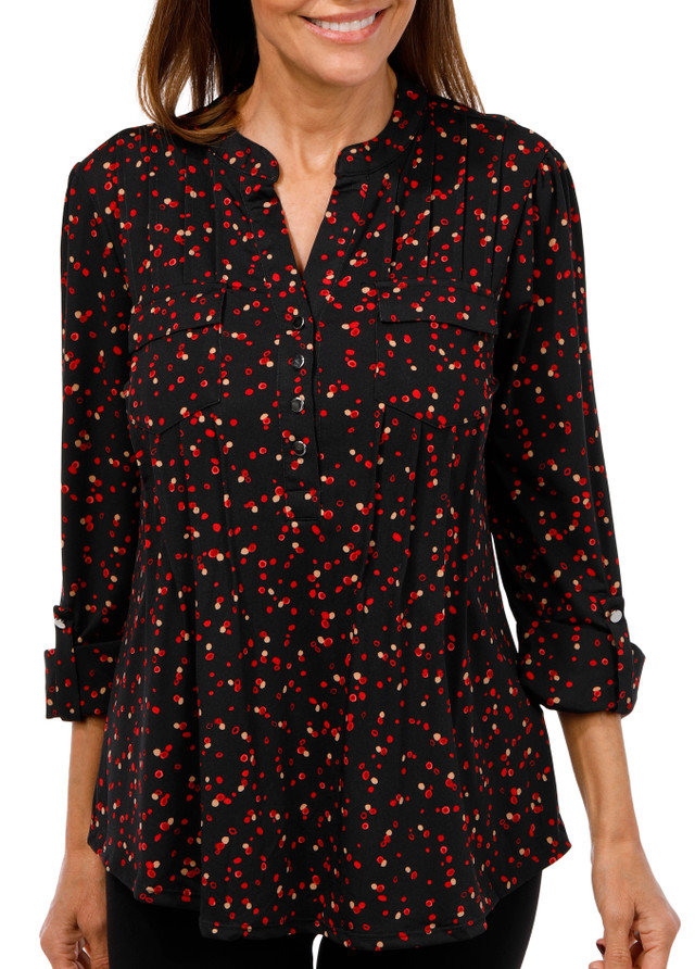 This women's 3/4 sleeve pleated print top combines comfort with polished style. Featuring chest pockets, split neckline, and roll tab sleeves, it is perfect for work or casual outings. The pleated detail adds texture while the print brings a fresh, modern touch. Top length measures approximately 24 inches. Fabrication 96% polyester, 4% spandex