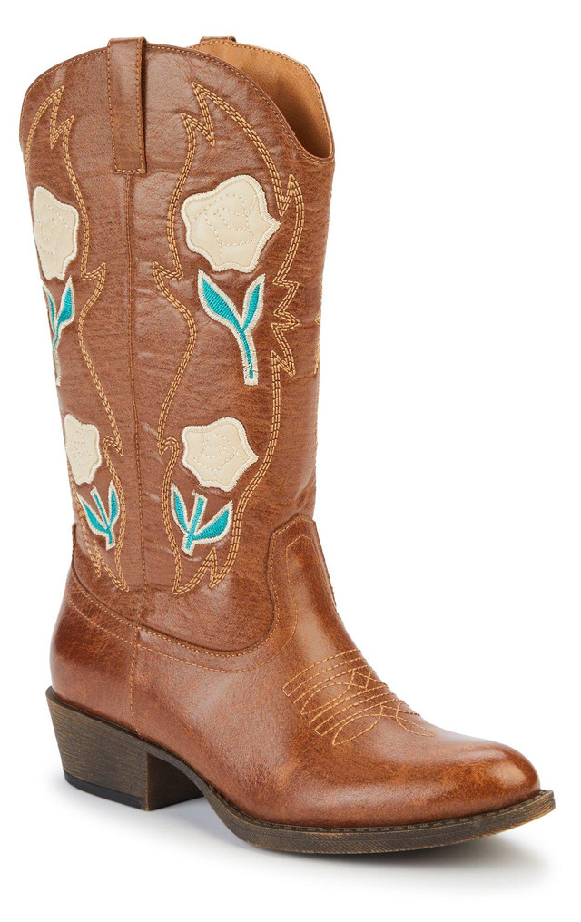 Ride high, walk bold in the Women's Patsy Cowboy Boot. Features faux leather upper in a cowboy boot style with an almond toe, pull on entry, pull on loops, smooth lining with padded insole, durable synthetic outsole and 1.5 in. stacked heel height.