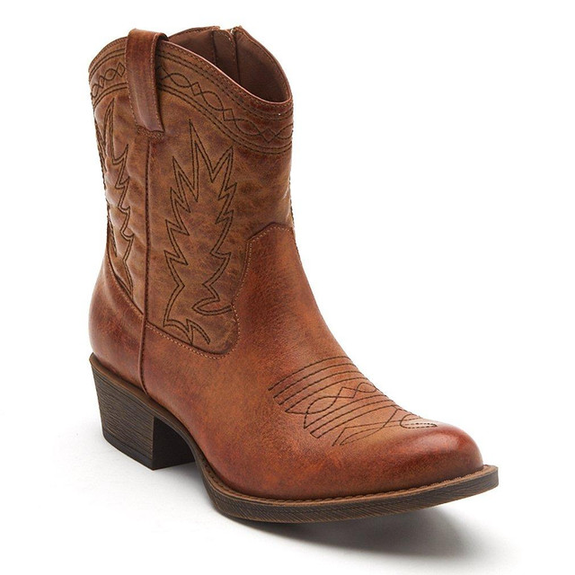 Ride off into the sunset in the Women's Pistol Cowboy Boot. Features faux leather upper in a cowboy boot style with an almond toe, side zipper entry, intricate stitching setail, side pull tab, canvas lining with a padded insole and durable synthtic outsole.