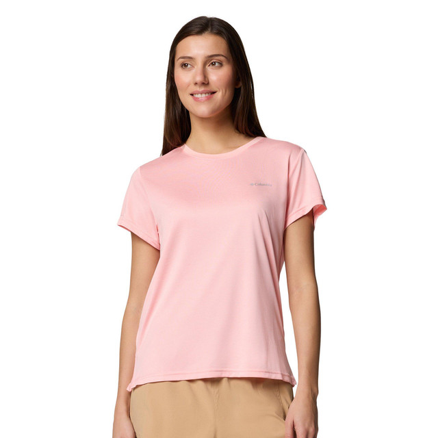 You'll love wearing this women's Columbia bluevista hill short sleeve crewneck t-shirt. Features Omni-WICK, vents at side hem, drop tail hem and straight hem. 26 inch length frm shoulder to hem.