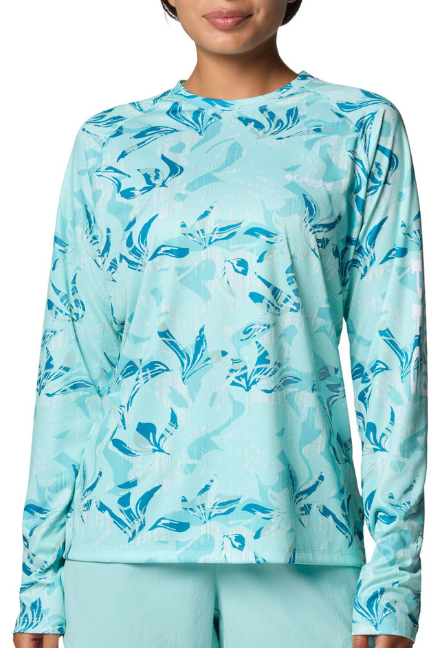 Enjoy your outdoor passion with this long sleeve tee. It features a print design on soft lightweight stretch fabric, Omni-Wick and Omni-Shade technology, and UPF 50 protection. The top length measures approximately 27 in. Fabrication 100% recycled polyester.