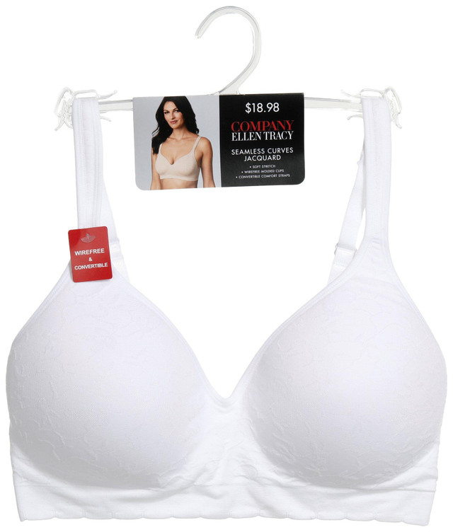 Introducing the Seamless Curves Jacquard Bra, where elegance meets comfort. Crafted with soft stretch fabric, this bra features wirefree molded cups for a natural shape and ultimate support. The jacquard design adds a touch of sophistication, while the convertible comfort straps offer versatile styling options. Perfect for all-day wear, this bra ensures you feel confident and comfortable, no matter the occasion. Fabrication is 94% nylon, 6% spandex.