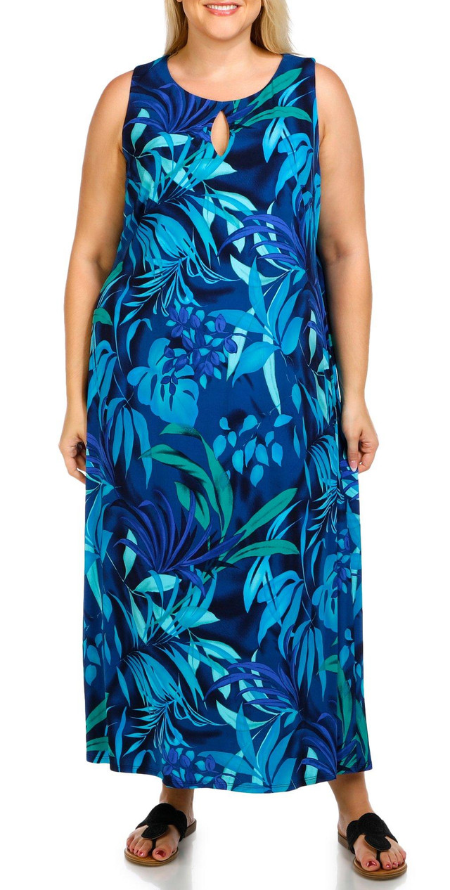 This plus size sleeveless maxi dress is made of polyester and spandex, and features a floral print with a keyhole neckline, and tie back detail. Its' soft stretch fabric and flowing silhouette make it a stylish and comfortable choice for warm weather occasions.