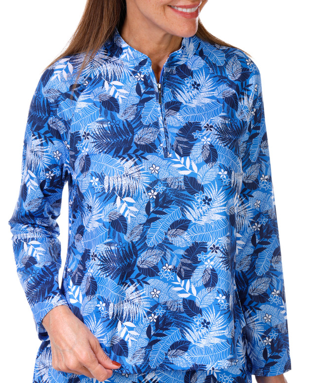 Move in style with this Petite Active 1/4 Zip Textured Palms Top. Featuring a vibrant palm tree print, moisture-wicking fabric, UPF protection, and performance stretch, it is designed for comfort and flair. The quarter zip neckline adds versatility for workouts or casual wear. Fabrication 92% polyester, 8% spandex