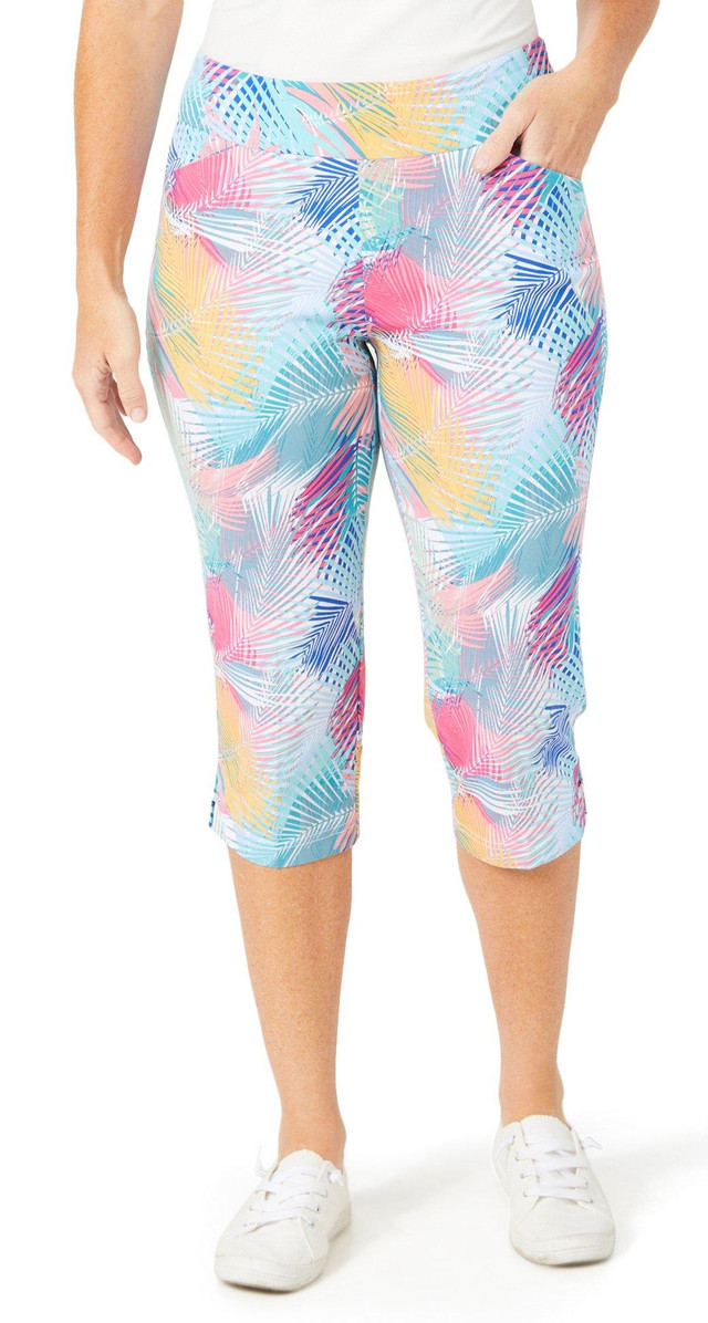 These capris feature a tropical leaf print with grommet accents around the ankles. The elastic waist offers comfort and ease of wear. Two front pockets add function to the stylish design. Ideal for warm weather and casual outings. Fabrication 77% rayon, 20% nylon, 3% spandex.