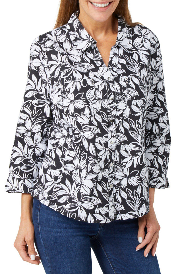 Add a touch of charm with this petite 3/4 sleeve top featuring a split collar, button down front, and two chest pockets. The soft floral pattern brings a fresh, feminine vibe to any outfit, making it perfect for both casual days and dressier occasions. Fabrication is 67% cotton, 29% polyester, and 4% spandex.