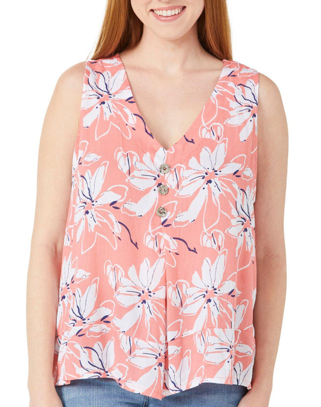 Elevate your style with this Petite Back Front Detail Printed Top! Made from 100% rayon, it offers a soft, breathable feel. Featuring a flattering V-neckline and button-front detailing, along with the chic back button accents, this top adds a touch of elegance to any outfit, perfect for both casual and dressy occasions.