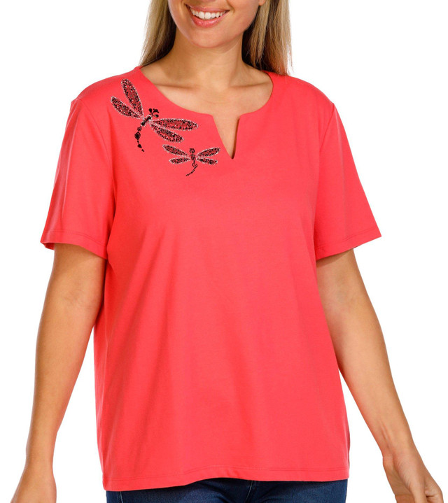 The Petite Dragonfly Solid Short Sleeve Top is a stylish and comfortable addition to your wardrobe. Made from a soft 60% cotton and 40% polyester blend, it offers a breathable, lightweight fit. The solid color design is complemented by a charming dragonfly detail, adding a touch of elegance and whimsy. With a 24-inch length, this top is perfect for casual wear or dressing up for a more polished look.
