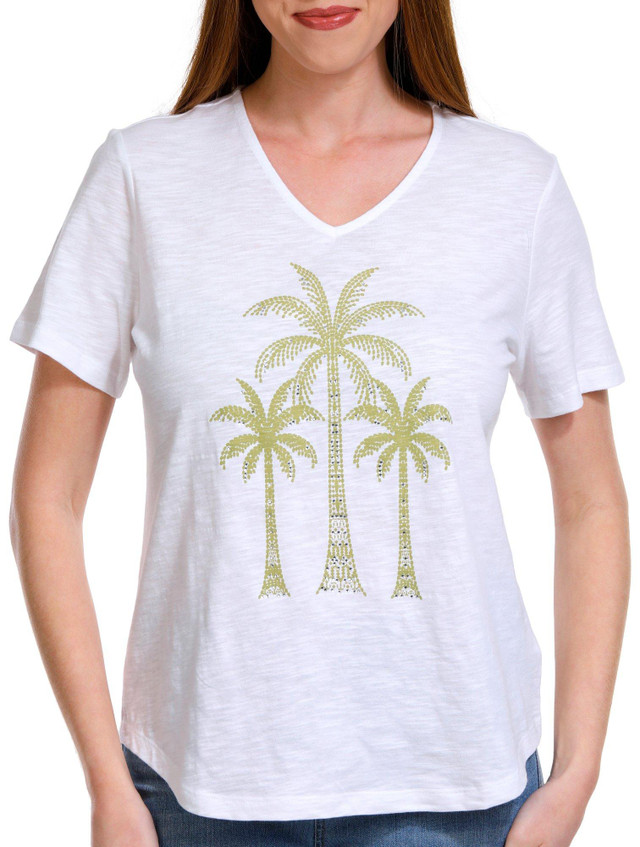 The Short Sleeve V-Neckline Top is a chic and comfortable addition to your wardrobe. Made from a soft 100% cotton, it offers breathability and comfort with just the right amount of stretch. The V-neckline adds a flattering touch, while the embellished details enhance its stylish look. With a 25-inch length, this petite top is perfect for casual or semi-formal occasions.
