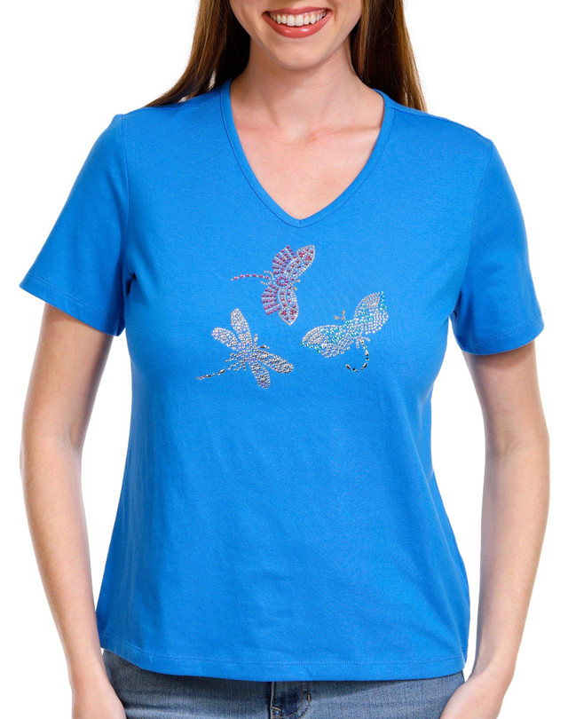 The Short Sleeve V-Neckline Top is a chic and comfortable addition to your wardrobe. Made from a soft 60% cotton and 40% polyester blend, it offers breathability and comfort with just the right amount of stretch. The V-neckline adds a flattering touch, while the embellished details enhance its stylish look. With a 25-inch length, this petite top is perfect for casual or semi-formal occasions.